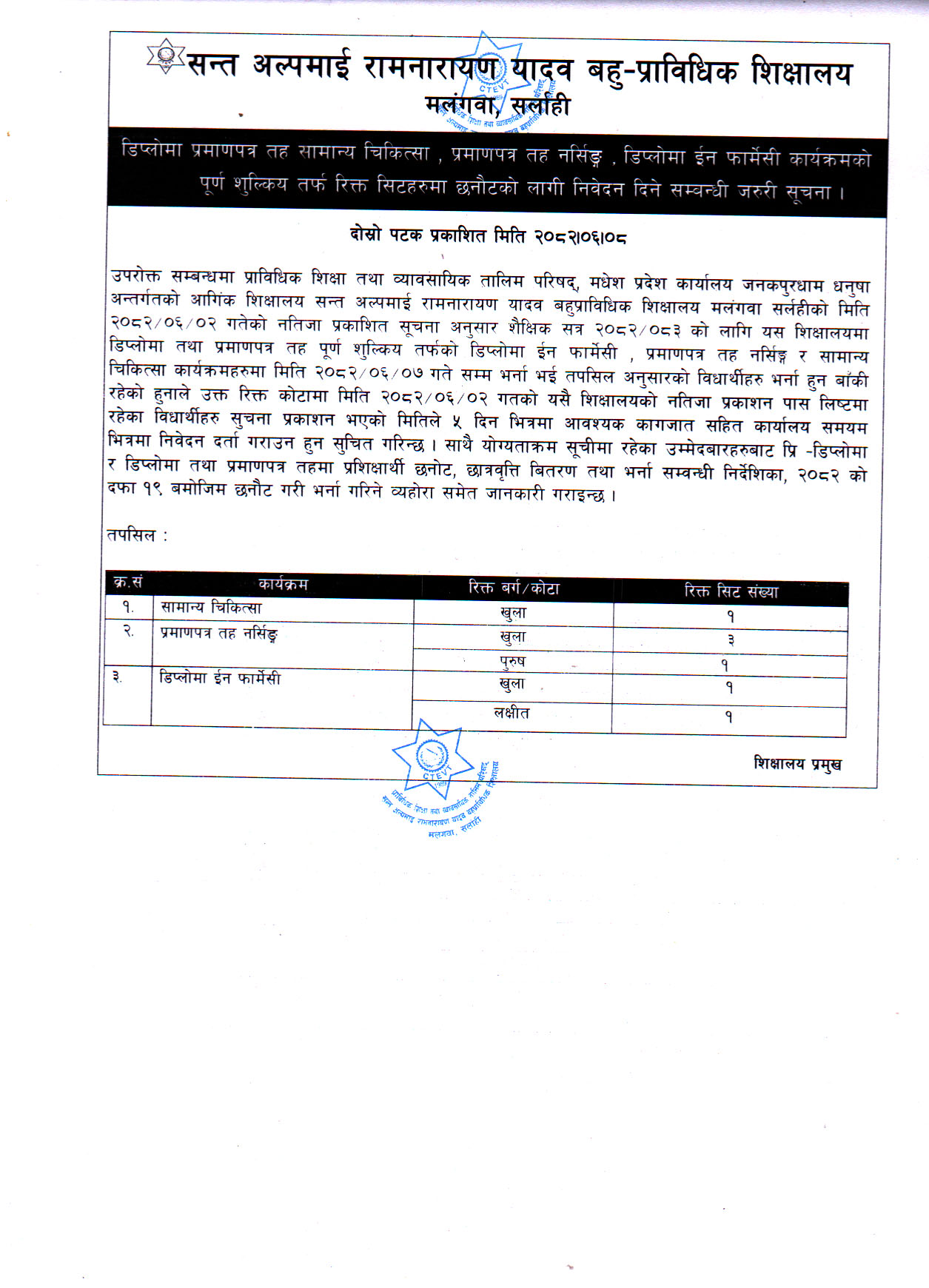 मंगलवा, सर्लाही बहुप्राविधिक शिक्षालय 2082/06/08